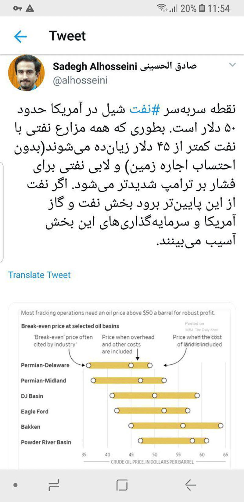 به گزارش اقتصادآنلاین، سیدمحمد صادق الحسینی نوشت: نقطه سربهسر نفت شیل در آمریکا حدود ۵۰ دلار است. بطوری که همه مزارع نفتی با نفت کمتر از ۴۵ دلار زیانده میشوند(بدون احتساب اجاره زمین) و لابی نفتی برای فشار بر ترامپ شدیدتر میشود. اگر نفت از این پایینتر برود بخش نفت و گاز آمریکا و سرمایهگذاریهای این بخش آسیب میبینند.