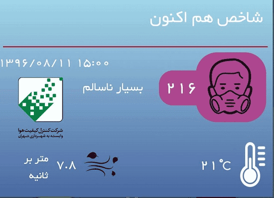 به نقل از پایگاه اطلاع رسانی کیفیت هوای تهران، «شاخص کیفیت هوا (Air Quality Index = AQI) معیاری برای تعیین روزانه کیفیت هوا و میزان ارتباط آن با سطوح سلامتی افراد است که به ترتیب از صفر تا ۵۰ در شرایط پاک (سبز)، ۵۱ تا ۱۰۰ در شرایط سالم (زرد) (حدمجاز استاندارد یا حد سلامت)، ۱۰۱ تا ۱۵۰ در شرایط ناسالم برای گروه حساس (نارنجی)، ۱۵۱ تا ۲۰۰ در شرایط ناسالم (قرمز)، ۲۰۱ تا ۳۰۰ در شرایط بسیار ناسالم (بنفش) و ۳۰۱ تا ۵۰۰ در شرایط خطرناک (ارغوانی) تعیین شده است».