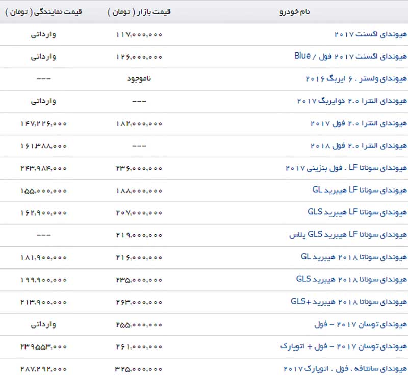 لیست قیمت برخی از محصولات هیوندای در بازار و از درب نمایندگی به شرح زیر است: