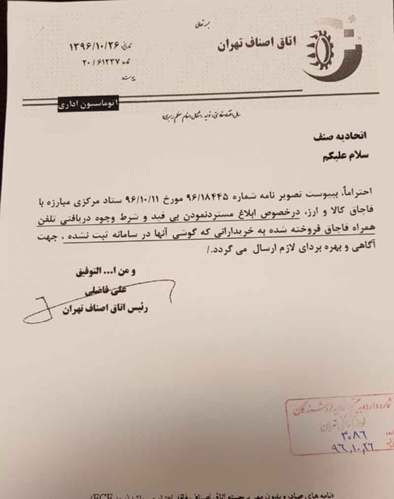 به گزارش تسنیم،بر این اساس، علی فاضلی رئیس اتاق اصناف نیز با ارسال نامهای به اتحادیه صنفی این ابلاغیه را به اطلاع آنها رساند.