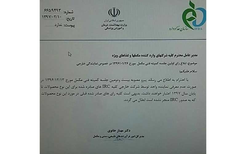 به گزارش مهر ،وی با عنوان این مطلب که در صورت عدم معرفی نماینده انحصاری مکمل های وارداتی امکان صدور کد IRC برای این نوع محصولات صادر نخواهد شد، افزود: واردات این نوع محصولات فقط تا پایان سال ۹۷ اعتبار خواهد داشت.
