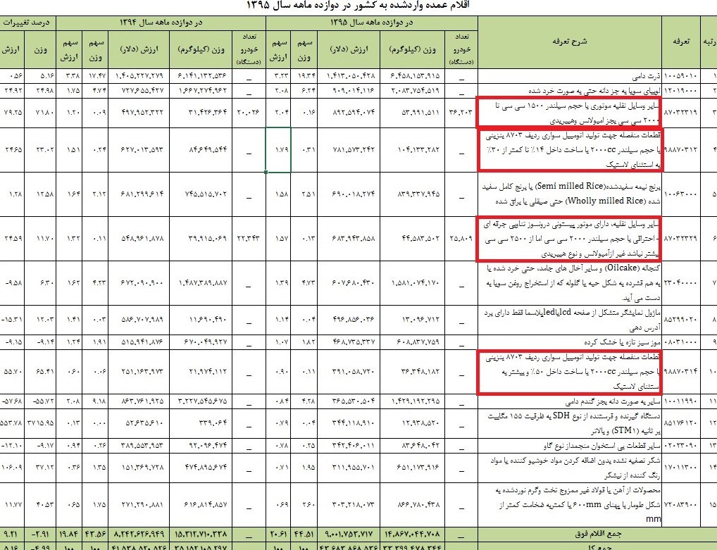 بر اساس آمار واردات ۱۲ ماهه سال ۹۵، وسائل نقلیه موتوری با حجم ۱۵۰۰ تا ۲۰۰۰سی سی با ثبت رکورد ۸۹۲ میلیون دلار در رده سوم، محصولات وارداتی قرار گرفته است.