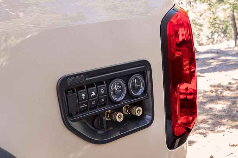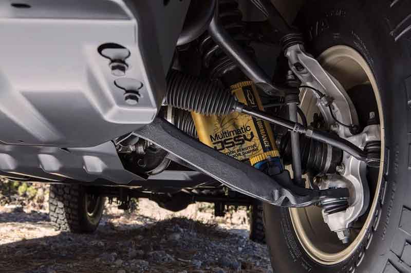 سیستم تعلیق ZR2 AEV همان سیستمی است که در پیکاپ ZR2 محصول مشترک شورولت و تیم هال ریسینگ (Hall Racing) استفاده شده است (تصویر بالا). پیکاپ مسابقهای هال ریسینگ ZR2، قابلیتهایی چون دمپرهای DSSV تقویت شده، افزایش ارتفاع ۳.۸ سانتیمتری، ورودی هوای آفرود، اگزوزهای سفارشی، تایرهای مخصوص آفرود ۳۳ اینچی از برند گودیر (Goodyear)، پنل محافظتی کف خودرو، میل کاردان فولادی و چرخهای عریضتر دارد؛ شورولت ZR2 با تیونینگ هال ریسینگ، از یک پیشرانهی ۶ سیلندر V شکل با حجم ۳.۶ لیتر استفاده میکند.