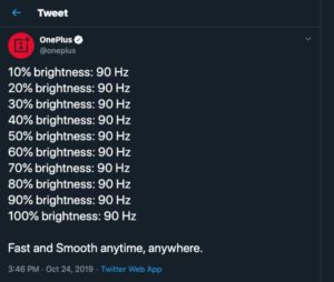 در همین راستا اخیرا وانپلاس در صفحهی توییترش بهصورت تلویحی به این موضوع اشاره کرده و مدعی شده است که گوشیهای جدیدش میتوانند رفرشریت ۹۰ هرتز را «در هر زمان و هر مکان» ارائه دهند. اسکرینشات مربوط به توییت وانپلاس را که اکنون حذف شده است، میتوانید در ادامه مشاهده کنید: