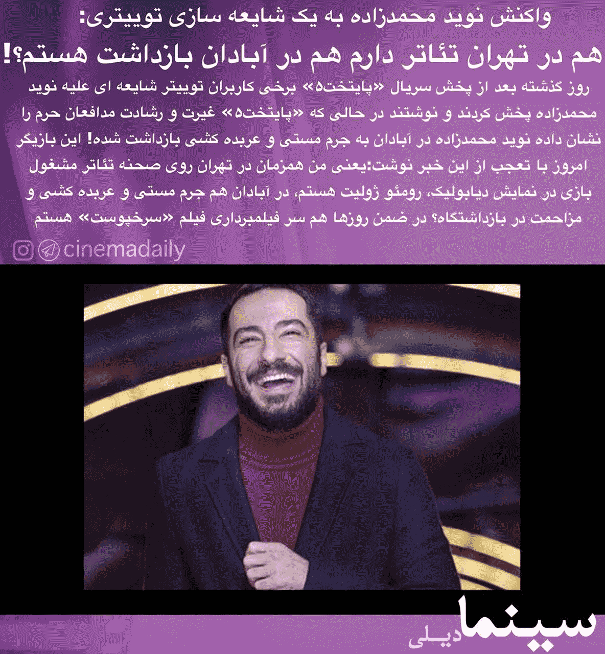 واکنش نوید محمدزاده به یک شایعه توییتری گفت: یعنی من همزمان در تهران روی صحنه تئاتر هستم و در آبادان هم به جرم مستی و عربده کشی و مزاحمت در بازداشتگاه؟!