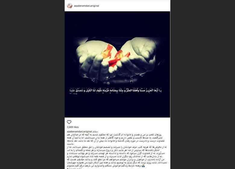 من آزاده نامداری، از خواهران و برادران مومنم میخواهم که مرا عفو کنند و بدانند حقایقی هست که نمیدانند. شاید روزی برسد که دیگر نیازی به توضیح نباشد و همه چیز آشکار شود.من همواره مهرشمارا درهمه شرایط زندگیم فراموش نمیکنم وامیدوارم این بارهم درکم کنید.»