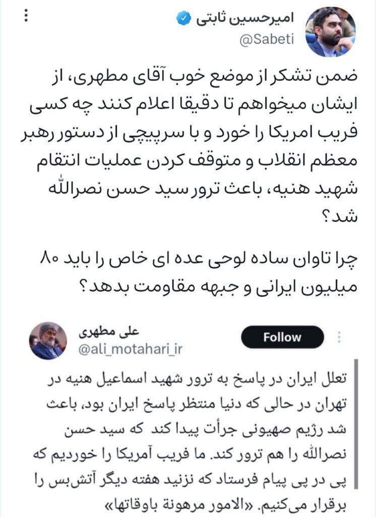 این توییت با واکنش امیرحسین ثابتی همراه شد که نوشت: «ضمن تشکر از موضع خوب آقای مطهری، از ایشان میخواهم تا دقیقا اعلام کنند چه کسی فریب آمریکا را خورد و با سرپیچی از دستور رهبر معظم انقلاب و متوقف کردن عملیات انتقام شهید هنیه، باعث ترور سیدحسن نصرالله شد؟ چرا تاوان ساده لوحی عده ای خاص را باید ۸۰ میلیون ایرانی و جبهه مقاومت بدهد؟»