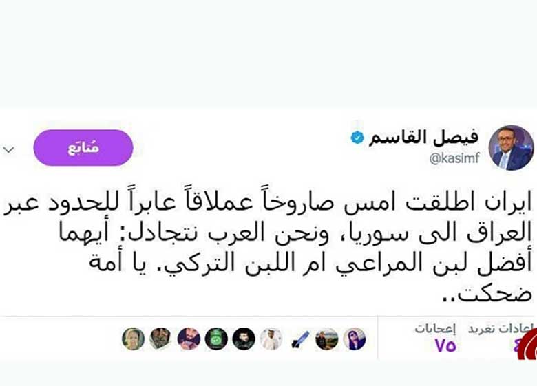 در همین راستا فیصل القاسم با انتشار پستی در توییتر شخصی خود نوشت:”موشکهای دوربرد ایران درحالی باعبوراز عراق به سوریه رسید که ما عربها درحال دعوا برسراین مسئله هستیم که دوغ طبیعی خوشمزهتر است یا دوغ ترکیه ای؟ امت عربی مسخره دیگران شده است.”