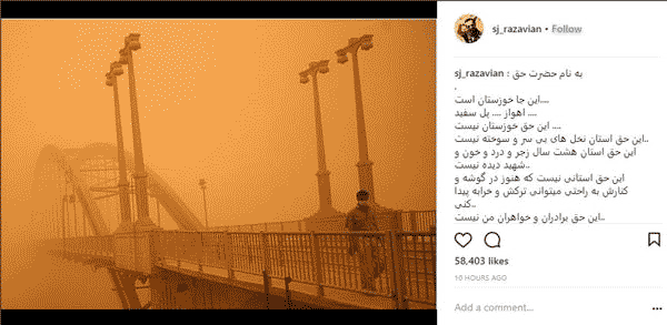 سیدجواد رضویان در واکنش به هوای غبارآلود این روزهای خوزستان متن کوتاهی در اینستاگرام منتشر کرد.