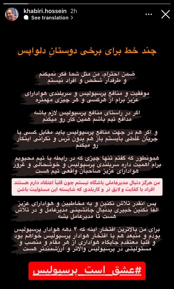 حسین خبیری عضو هیات مدیره باشگاه پرسپولیس با انتشار یک استوری به حواشی به وجود آمده درباره این تیم واکنش نشان داد.باشگاه پرسپولیس چند روزی است دچار حواشی زیاده شده و اختلاف بین مدیریت باشگاه و کادرفنی بیشتر از قبل نمایان شده است.