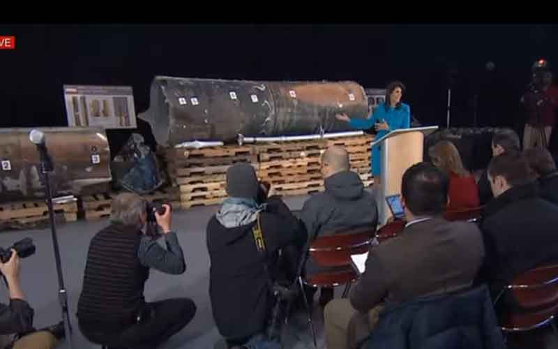 هیلی در کنفرانس خبری خود در کنار لاشه موشکی حاضر شد که مدعی بود از ایران به یمن ارسال و از آنجا به عربستان سعودی شلیک شده است.