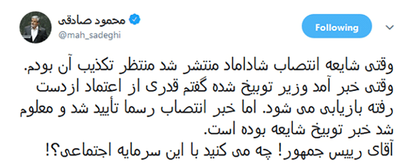 «وقتی شایعه انتصاب شاداماد منتشر شد منتظر تکذیب آن بودم. وقتی خبر آمد وزیر توبیخ شده گفتم قدری از اعتماد ازدست رفته بازیابی می شود. اما خبر انتصاب رسما تأیید شد و معلوم شد خبر توبیخ شایعه بوده است. آقای رییس جمهور! چه می کنید با این سرمایه اجتماعی؟!»