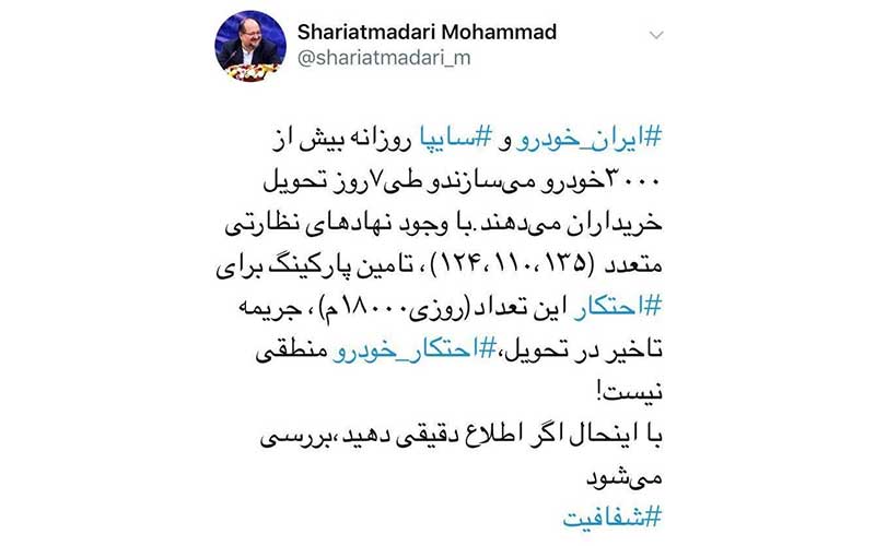 محمد شریعتمداری، وزیر صنعت، معدن و تجارت در صفحه شخصی خود در شبکههای اجتماعی، در واکنش به گرانی و احتکار خودرو نوشت: روزی سه هزار خودرو ساخته و تحویل میشود با این حال اطلاع دقیق دهید، بررسی میشود.