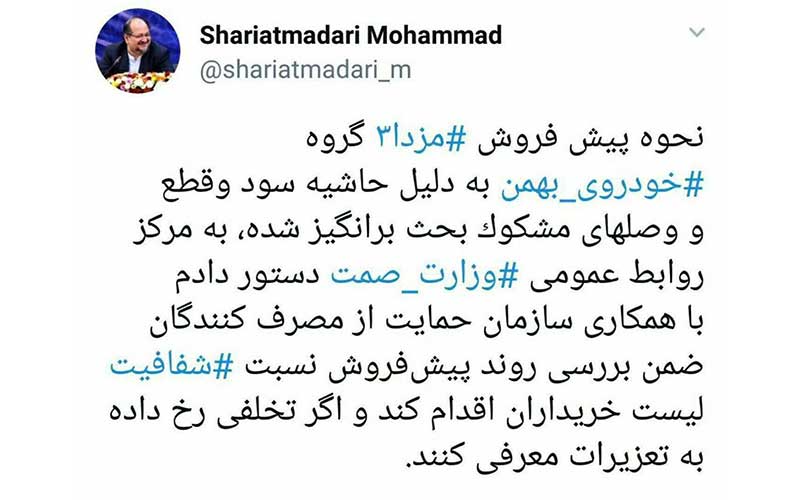 وزیر صنعت برای بررسی نحوه پیشفروش مشکوک مزدا ۳ گروه خودروی بهمن دستور فوری صادر کرد.