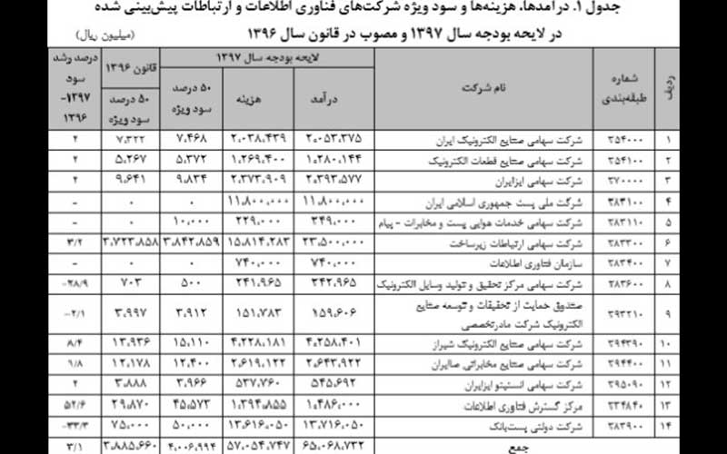 درصد افزایش سود در لایحه سال ۱۳۹۷ در مقایسه با قانون سال ۱۳۹۶ برای شرکت سهامی صنایع الکترونیک شیراز به میزان ۸.۴ درصد، برای شرکت سهامی صنایع مخابراتی صاایران ۱.۸ درصد و برای مرکز گسترش فناوری اطلاعات ۵۲.۶ درصد است.