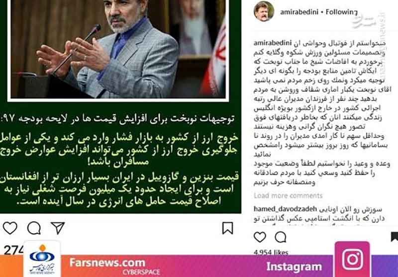 امیر عابدینی از مدیران باسابقه ورزش کشورمان در صفحه شخصی اینستاگرامش نوشت: میخواستم از فوتبال وحواشی ان وتصمیمات مسئولین ورزش شکوه وگلایه کنم برخوردم به افاضات شیخ ما جناب نوبخت که ایکاش تامین منابع بودجه را بگونه ای دیگر توجیه میکرد ونمک روی زخم مردم نمی پاشید.