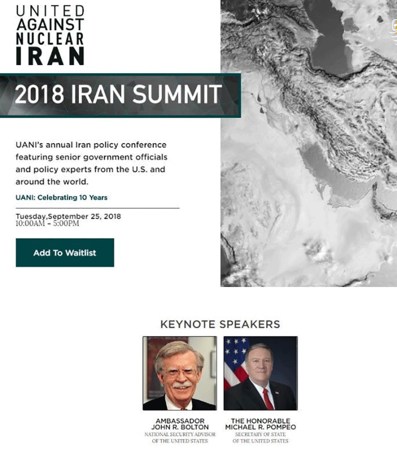 به گزارش فرارو، روز سه شنبه، مایک پومپئو، وزیر خارجه آمریکا و جان بولتون، مشاور امنیت ملی، در جریان فعالیتهای مجمع عمومی سازمان ملل، در نشست گروه موسوم به “متحد علیه ایران هستهای” (UANI) سخنرانی میکنند. این نشست درباره سیاست دولت ترامپ در قبال خاورمیانه و ارتباط آن با تندروترین نیروهای ضدایرانی در آمریکا و منطقه پرسشهایی مطرح میکند.