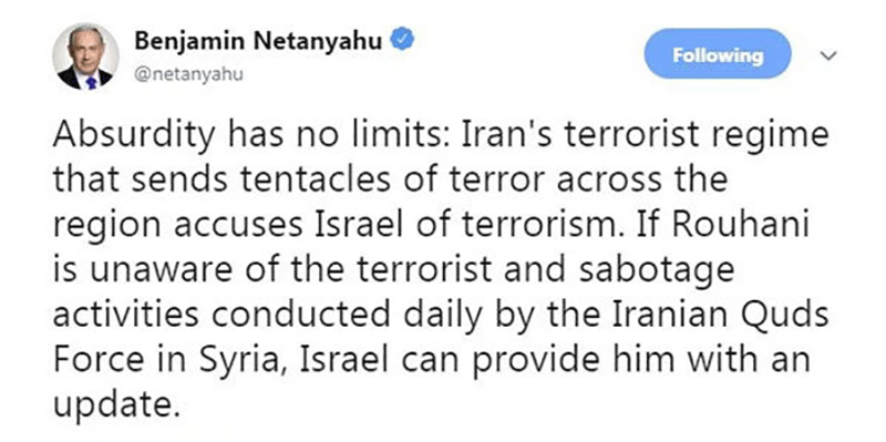 نتانیاهو در صفحه توئیتری خود با «پوچ و بیمعنی» خواندن اظهارات روحانی، مدعی شد: «حماقت محدودیتی ندارد. رژیم تروریست ایران که بازوهای خود را در منطقه گسترانیده، اسرائیل را به تروریسم متهم میکند».