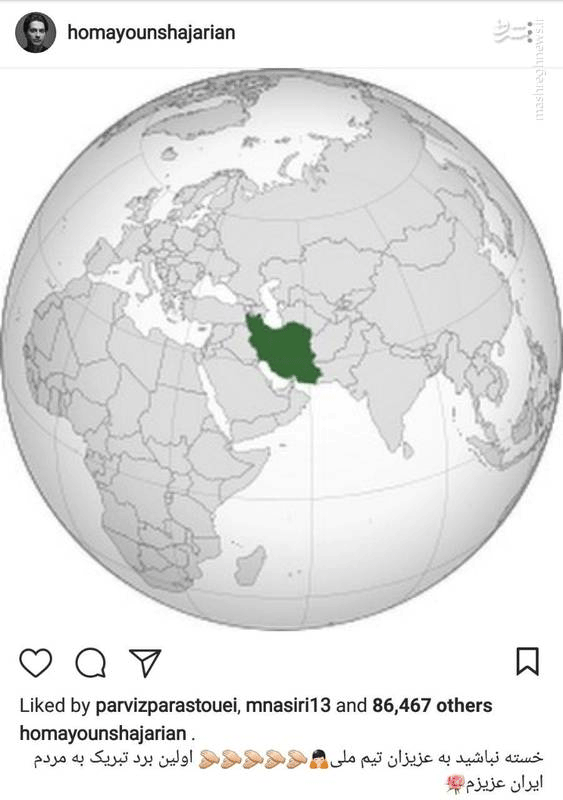 همایون شجریان پست زیر را در اینستاگرام خود به مناسبت پیروزی تیم ملی ایران مقابل مراکش در جام جهانی ۲۰۱۸ روسیه منتشر کرد