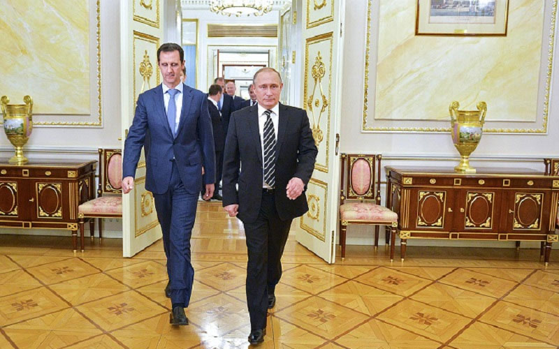 ولادیمیر پوتین از همتای سوری خود “بشار اسد” در کرملین استقبال می‌کند (۲۰ اکتبر ۲۰۱۵). اسد در اولین سفر خارجی خود پس از آغاز جنگ سوریه به پوتین گفت که مبارزات روسیه در کشورش به عقب راندن “تروریسم” کمک کرده است.