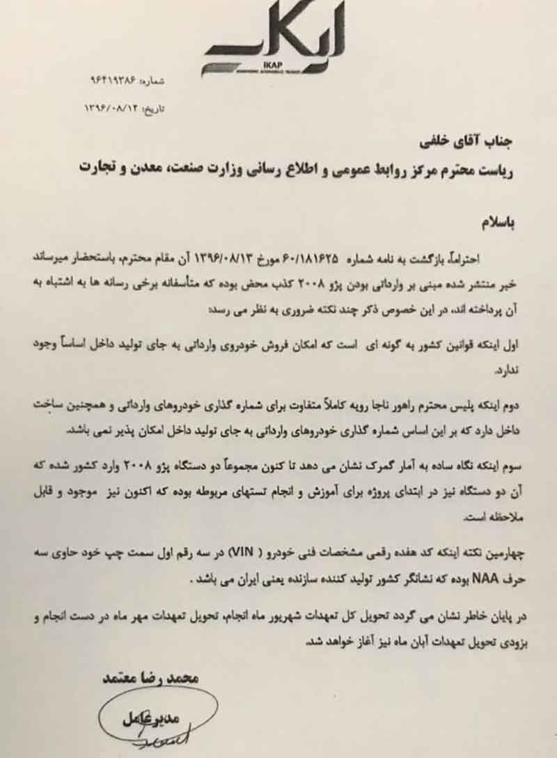 شرکت ایکاپ ایران خودرو در واکنش به انتشار وارداتی بودن پژو ۲۰۰۸ با ارسال نامهای به ارائه توضیحاتی پرداخته است.