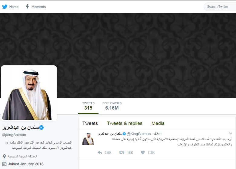 «سلمان بن عبدالعزیز آلسعود» پادشاه عربستان سعودی در خصوص نشست رئیسجمهوری آمریکا با سران کشورهای حاشیه خلیجفارس در ریاض، اقدام به انتشار یک پیام توئیتری کرد.