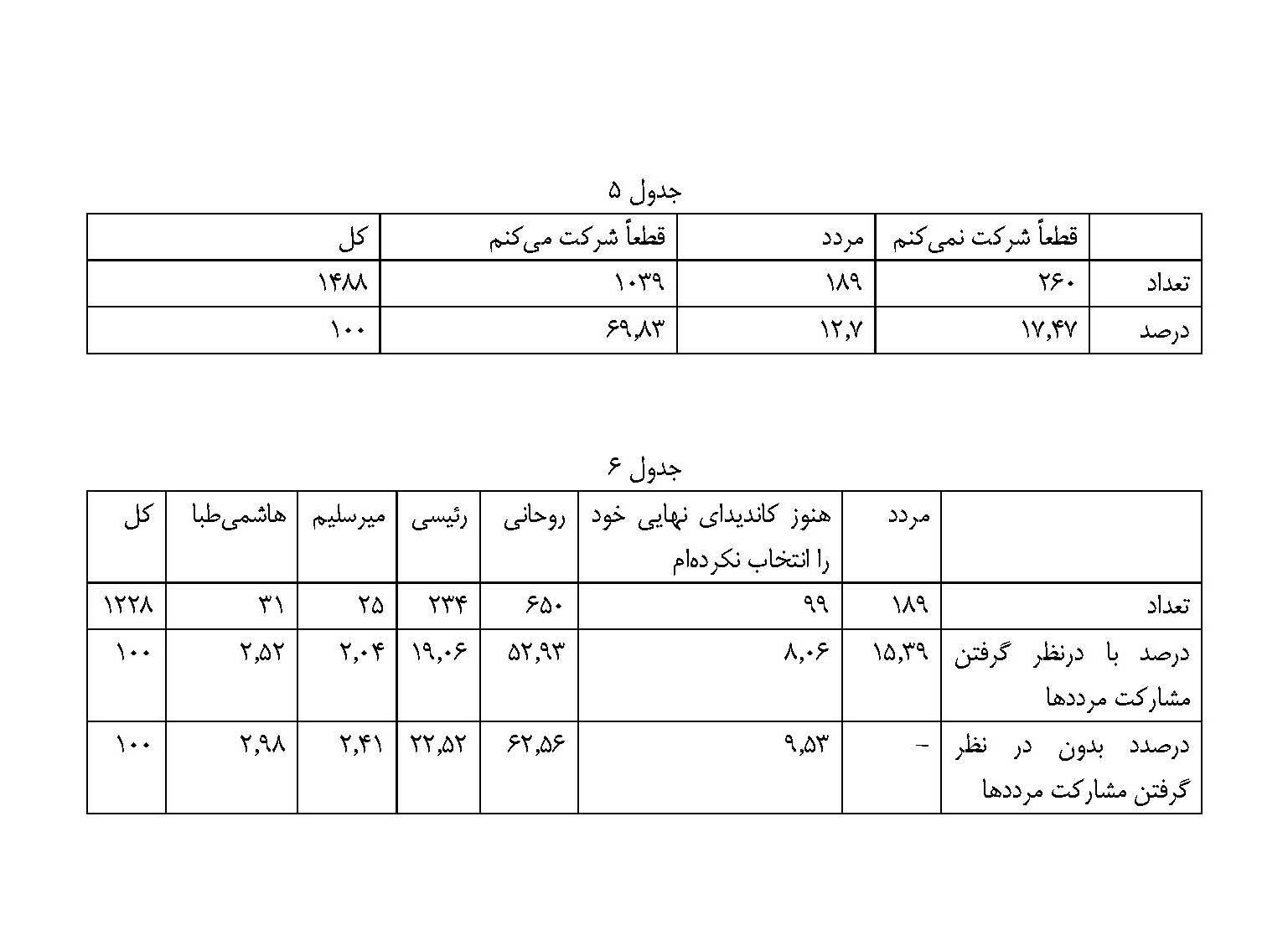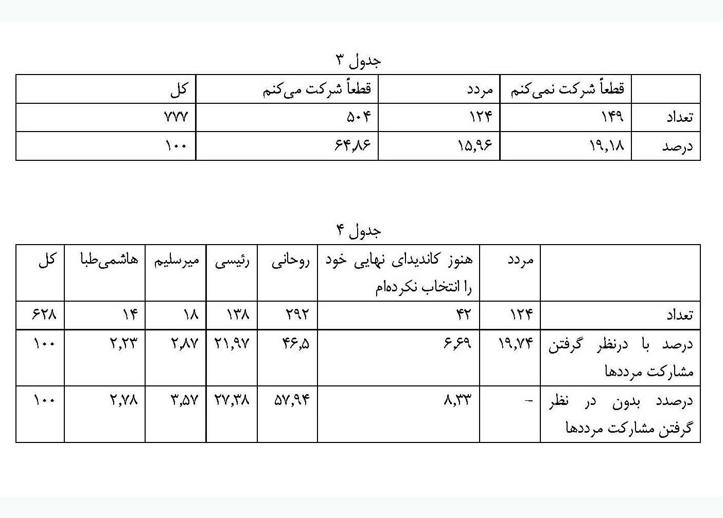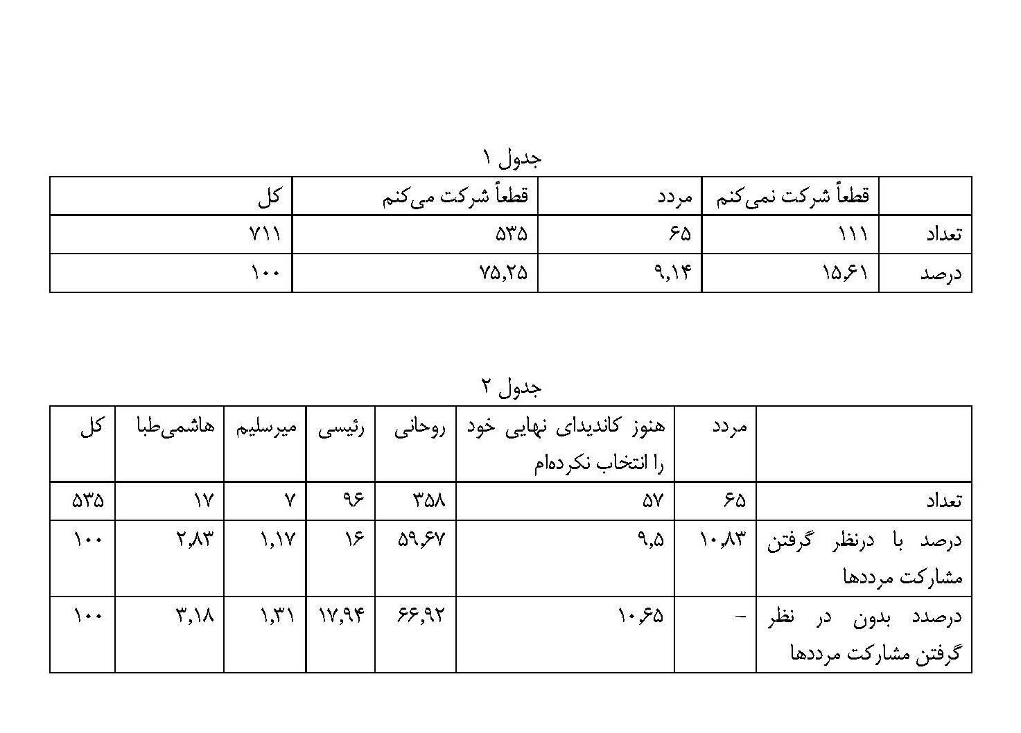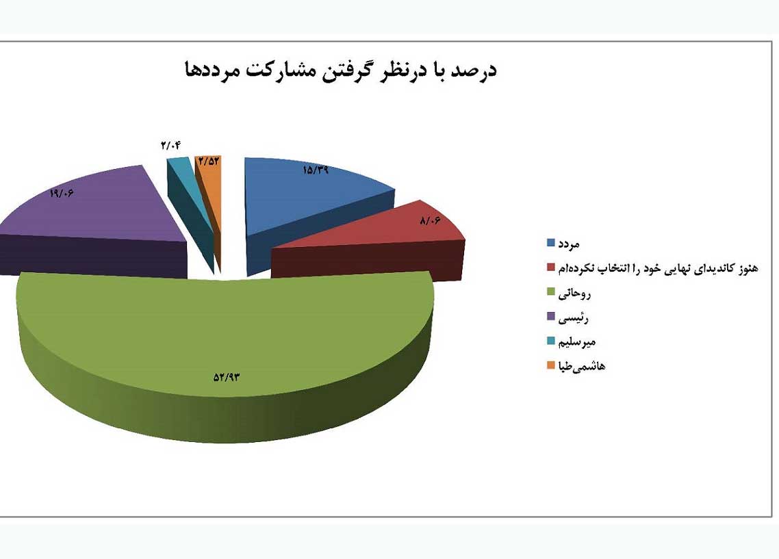 از میان ۴۶۲ مردی که تصمیم قطعی برای شرکت در انتخابات دارند و کاندیدای نهایی خود را نیز انتخاب کردهاند، ۲۹۲ نفر به دکتر روحانی، ۱۳۸ نفر به حجتالاسلام رئیسی، ۱۸ نفر به آقای میرسلیم و ۱۴ نفر به مهندس هاشمیطبا رای خواهند داد.