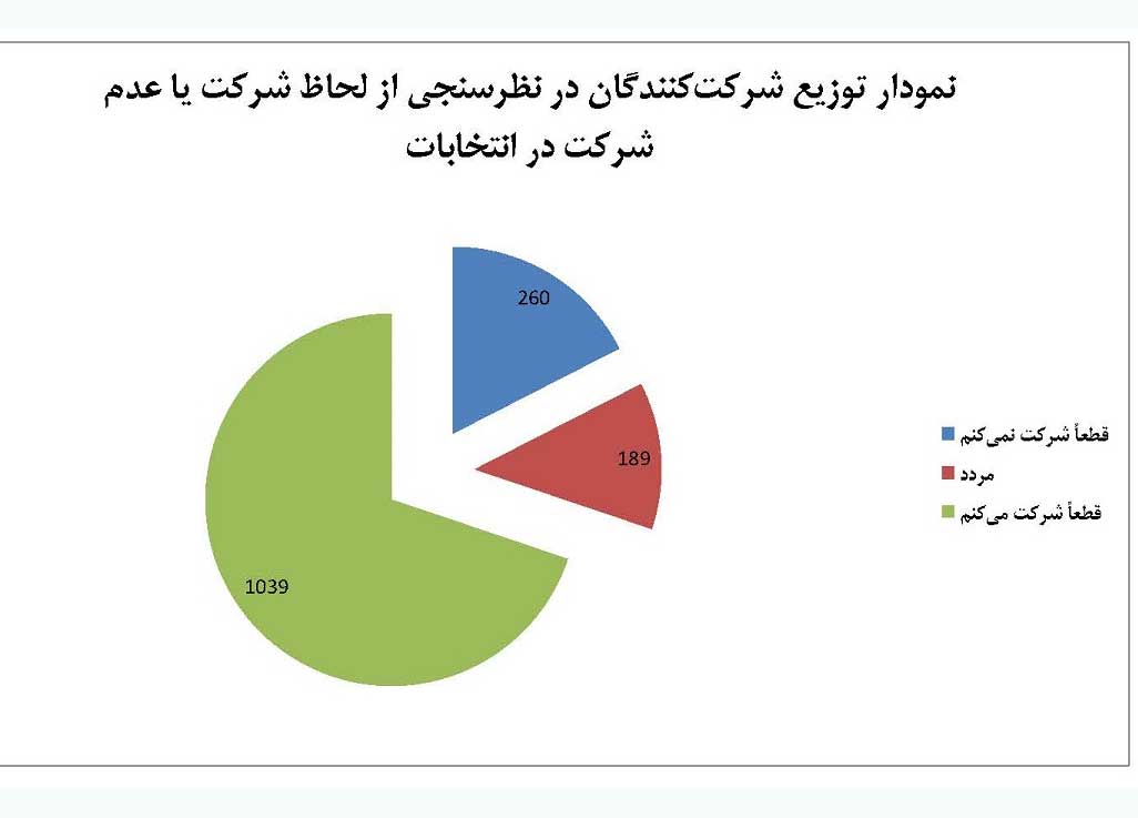 نتایج کلی این نظرسنجی، حاکی از این است که از مجموع ۱۴۸۸ شرکتکننده در این نظرسنجی از جامعه آماری ۱۵۰۰ نفری، ۲۶۰ نفر معادل ۴۷/۱۷درصد اعلام کردهاند که قطعا در انتخابات ۲۹ اردیبهشت ماه شرکت نخواهند کرد، همچنین ۱۸۹ نفر یعنی ۷/۱۲ درصد هنوز برای شرکت یا عدم شرکت در انتخابات دچار تردید هستند و ۱۰۳۹ نفر معادل ۸۳/۶۹ درصد به طور قطعی از شرکت در انتخابات خبر دادهاند.