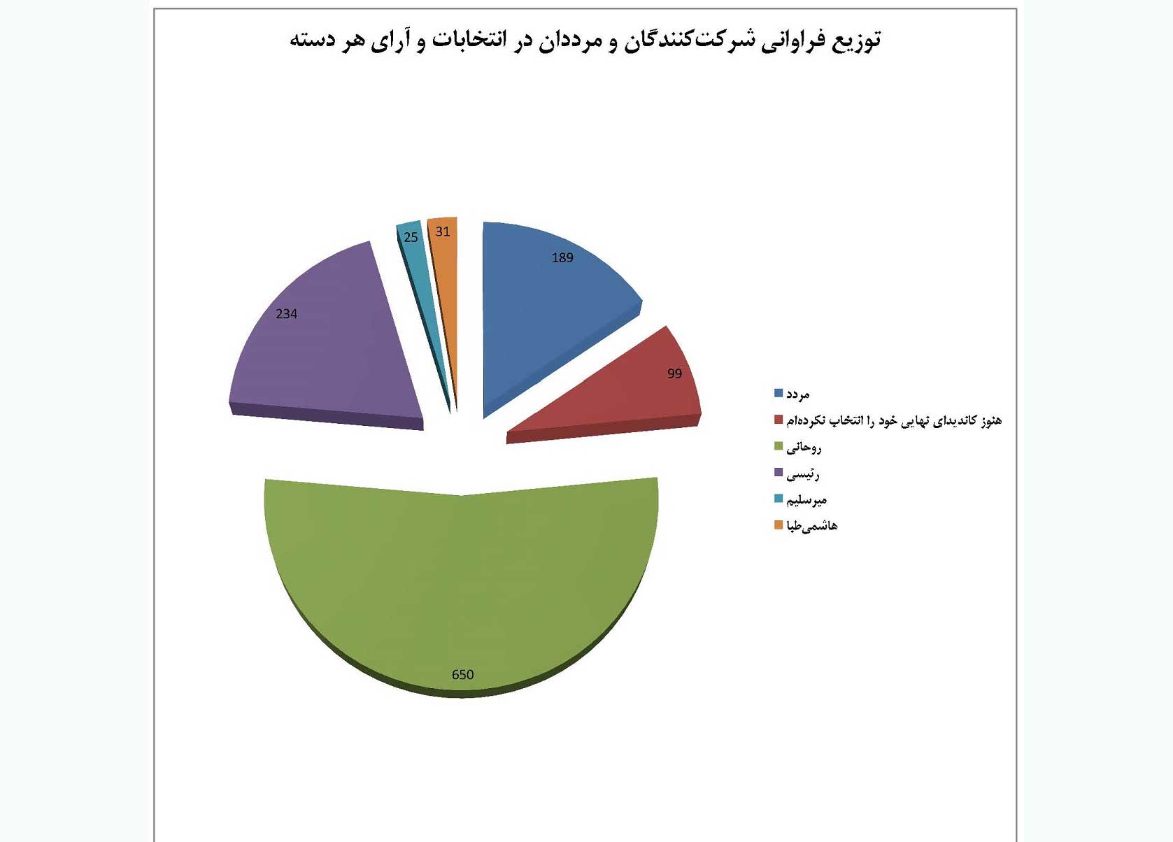 از میان ۴۷۸ نفری که تصمیم قطعی برای شرکت در انتخابات داشته و کاندیدای نهایی خود را نیز انتخاب کردهاند، ۳۵۸ نفر به دکتر روحانی، ۹۶ نفر به حجتالاسلام رئیسی، ۷ نفر به آقای میرسلیم و ۱۷ نفر به مهندس هاشمیطبا رای خواهند داد.