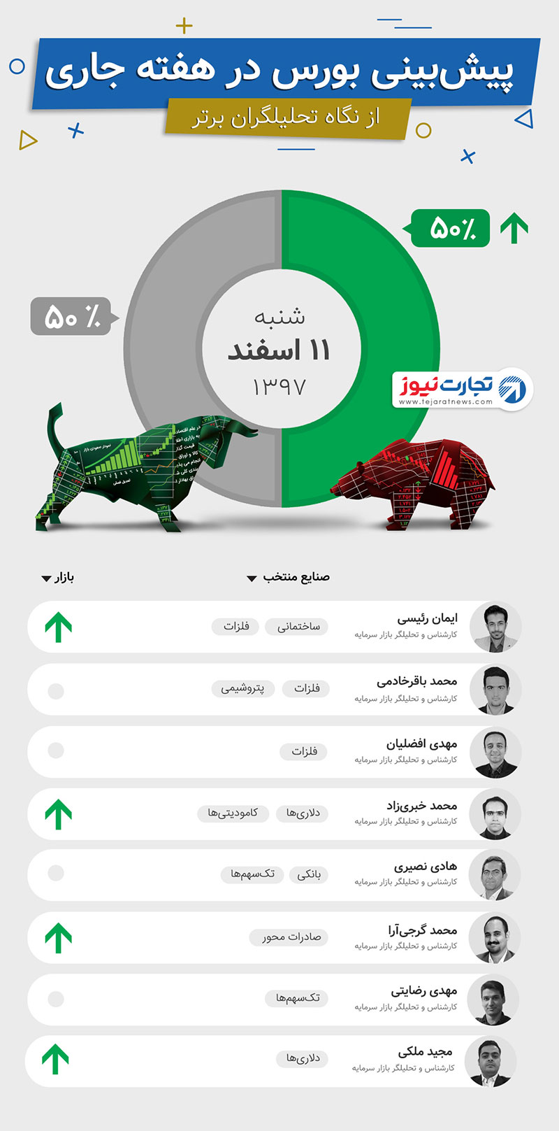 نظرسنجی این هفته از کارشناسان و معاملهگران بازار سرمایه، نشان میدهد که بازار در هفته دوم اسفند ماه صعودی و مثبت خواهد بود و گروه فلزات اساسی و تکسهمها پیشرو در قیمت سهام این هفته خواهند بود.