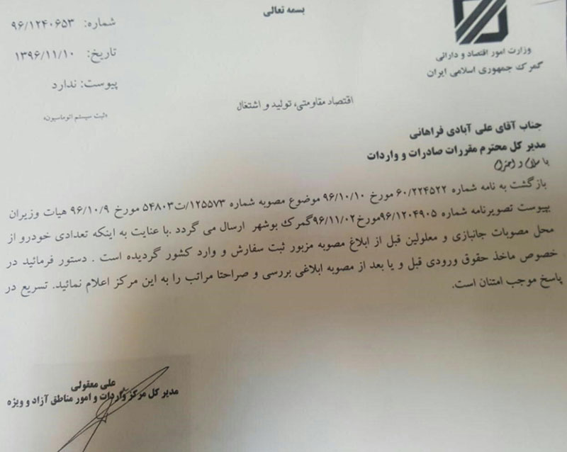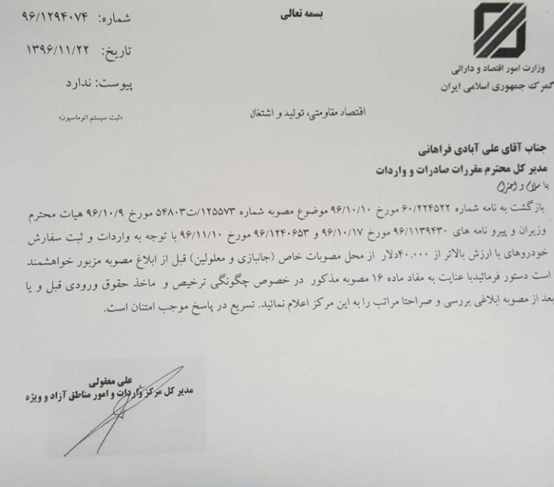 در ادامه دو نامه گمرک به وزارت صنعت برای تعیین تکلیف این خودروها قابل مشاهده است.