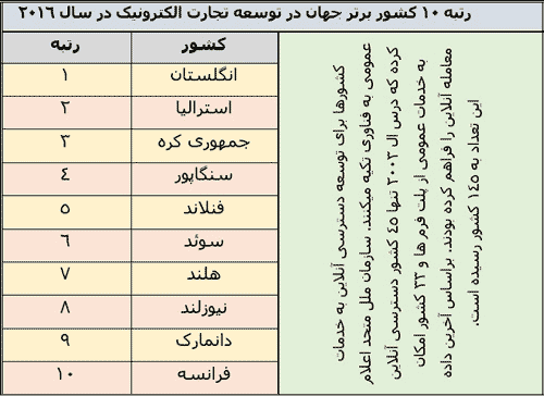 در همان سال ها، سازمان ملل متحد رتبه بندی کشورهای مختلف از نظر توسعه دولت الکترونیک را منتشر کرد. ایران در سال ۲۰۰۸ براساس پارامترهایی مثل حضور در وب (وبگاه های دولتی)، تعداد میزبانان اینترنتی، درصد افراد برخوردار از دسترسی برخط، رایانه شخصی، خط ثابت تلفن، تلفن همراه و تلویزیون و سرمایه انسانی (دسترسی به اطلاعات و نسبت جمعیت شهری و روستایی) رتبه ۱۰۸ را کسب کرد. این رتبه در سال ۲۰۱۰ به ۱۰۲ رسید و در سال ۲۰۱۲ با دو پله بهبود به جایگاه صدم رسیدیم. ایران در سال ۲۰۱۶ رتبه ۱۰۶ را در توسعه دولت الکترونیک کسب کرده است.