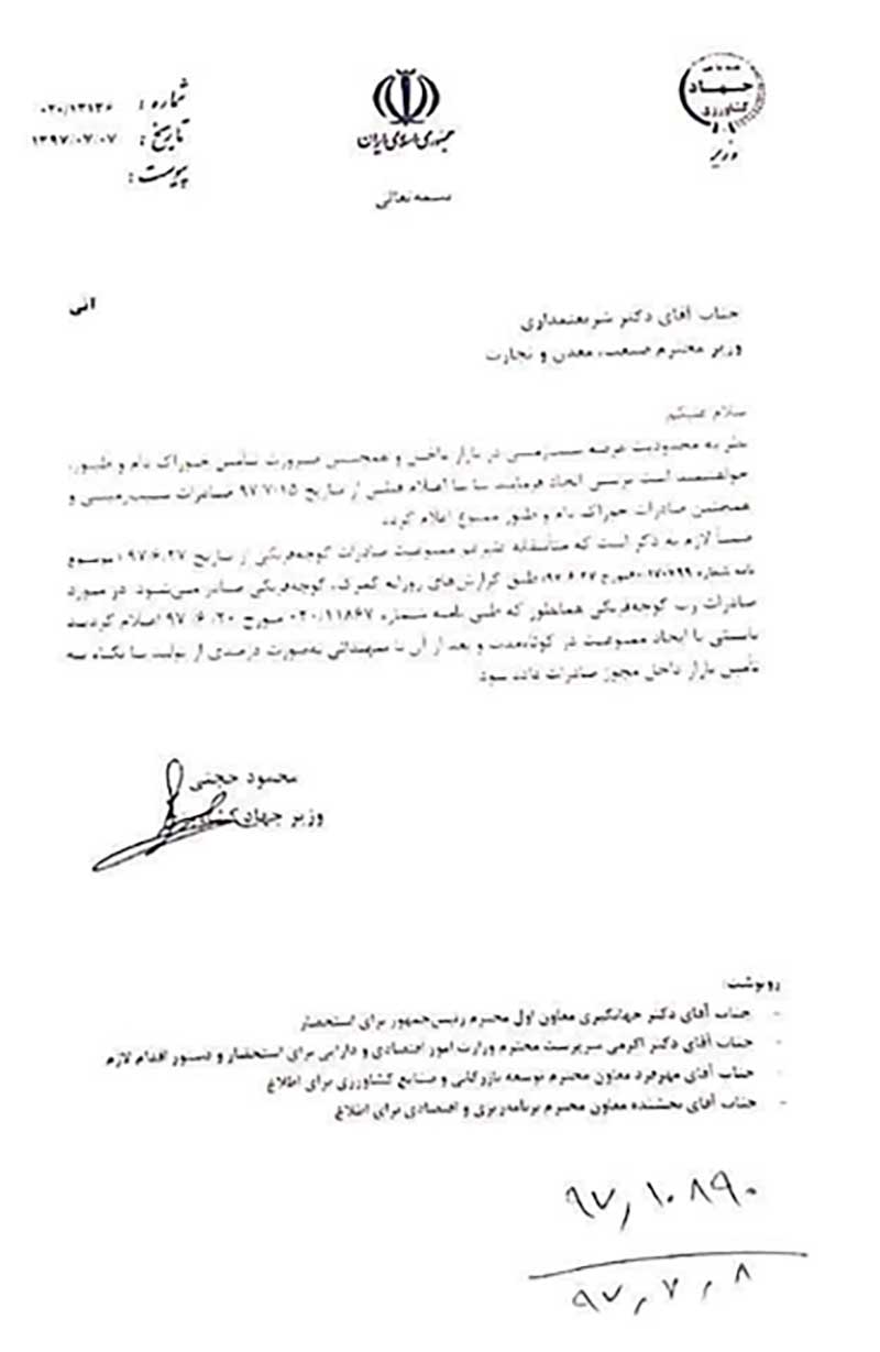 حالا بعد از گذشت چند روز از دستور ممنوعیت صادرات گوجه فرنگی، محمود حجتی وزیر جهاد کشاورزی با ارسال نامه ای گلایه آمیز به محمد شریعتمداری وزیر صنعت، معدن و تجارت از عدم توجه به ممنوعیت صادرات گوجه فرنگی و رب آن گلایه کرد. متن نامه که تصویر آن را در زیر مشاهده می فرمایید، بدین شرح می باشد: “نظر به محدودیت عرضه سیب زمینی در بازار داخلی و همچنین ضرورت تأمین خوراک دام و طیور، خواهشمند است ترتیبی اتخاذ فرمایید تا با اعلام قبلی از تاریخ ۱۵ مهر ۱۳۹۷ صادرات سیب زمینی و همچنین صادرات خوراک دام و طیور ممنوع اعلام گردد. ضمناً لازم به ذکر است که متأسفانه علی رغم ممنوعیت صادرات گوجه فرنگی از تاریخ ۲۷ شهریور ۱۳۹۷ موضوع نامه شماره ۱۷۰۷۹۹ مورخ ۲۷ شهریور ۱۳۹۷ طبق گزارش های روزانه گمرک، گوجه فرنگی صادر می شود. در مورد صادرات رب گوجه فرنگی همان طور که طی نامه شماره ۱۱۸۶۷/۲۰ مورخ ۲۰ اردیبهشت ۱۳۹۷ اعلام گردید بایستی با اتخاذ ممنوعیت در کوتاه مدت و بعد از آن با تمهیداتی به صورت درصدی از تولید با نگاه به تأمین بازار داخل مجوز صادرات داده شود”.