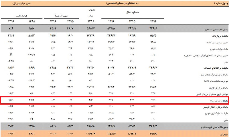 طبق آمار منتشر شده از سوی بانک مرکزی، مالیات بر فروش سیگار در سال ۹۶ حدود ۰.۳ درصد از مجموع مالیاتهای غیرمستقیم دولت را تشکیل داده که نسبت به سال ۹۵ این رقم تغییری نکرده است.