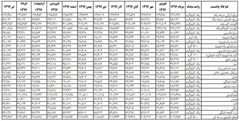 به گزارش مهر، جدول زیر نیز سری زمانی متوسط قیمت (به ریال) اقلام خوراکی منتخب در مناطق شهری کل کشور از مرداد ماه ۹۶ تا تیرماه ۹۷ را نشان میدهد.