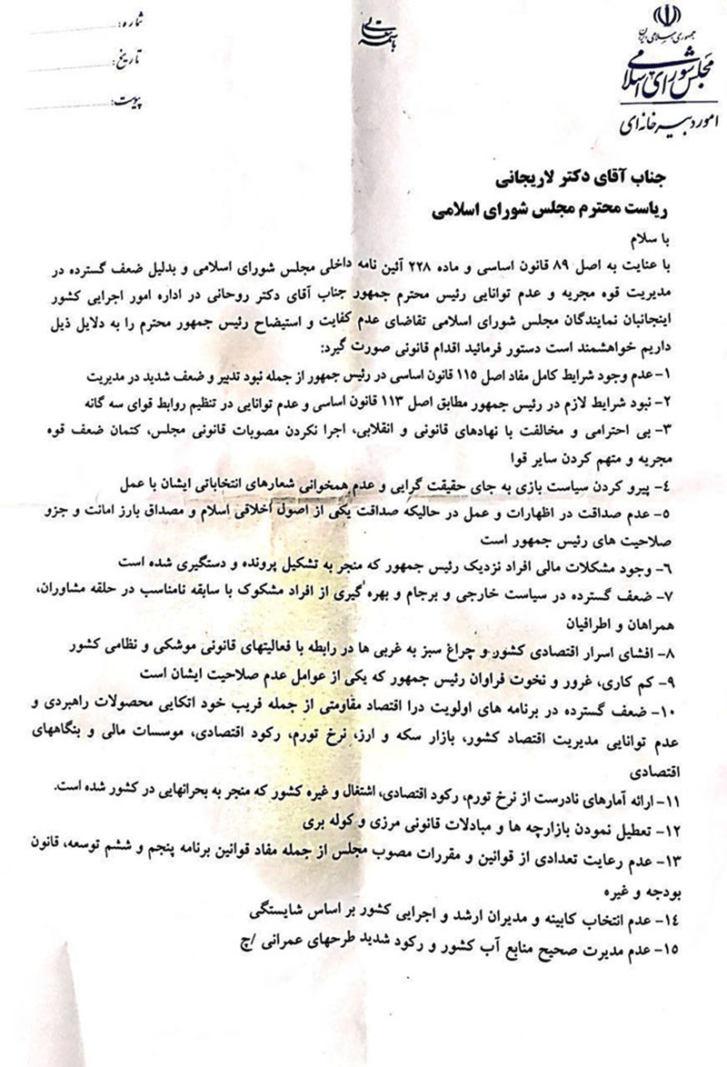 نامه طرح استیضاح رییس جمهور