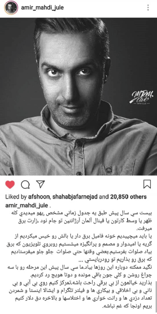 ژوله در واکنش به قطع شدن برق در این روزها در اینستاگرامش نوشت: بذارید خیالمون از بی برقی راحت باشه.