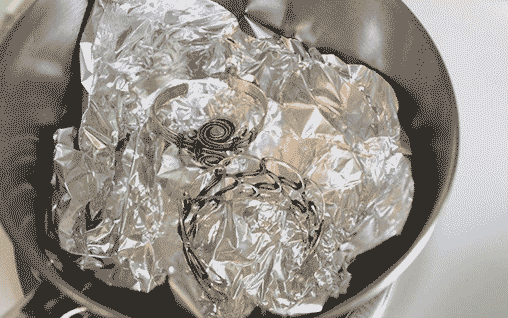 برای انجام این کار لازم است کاسهای را برداشته و با کاغذ آلومینیومی بپوشانید ، ظرف را با آب گرم پر کرده و کمی پودر رختشویی(فاقد مواد سفید کننده) داخل آن بریزید؛ جواهرات را داخل محلول ریخته و بعد از یک دقیقه کاملا آبکشی کنید. جواهراتتان را در معرض هوا بگذارید تا خشک شود. میتوانید از این محلول برای برق انداختن ظروف نقرهای هم استفاده کنید .