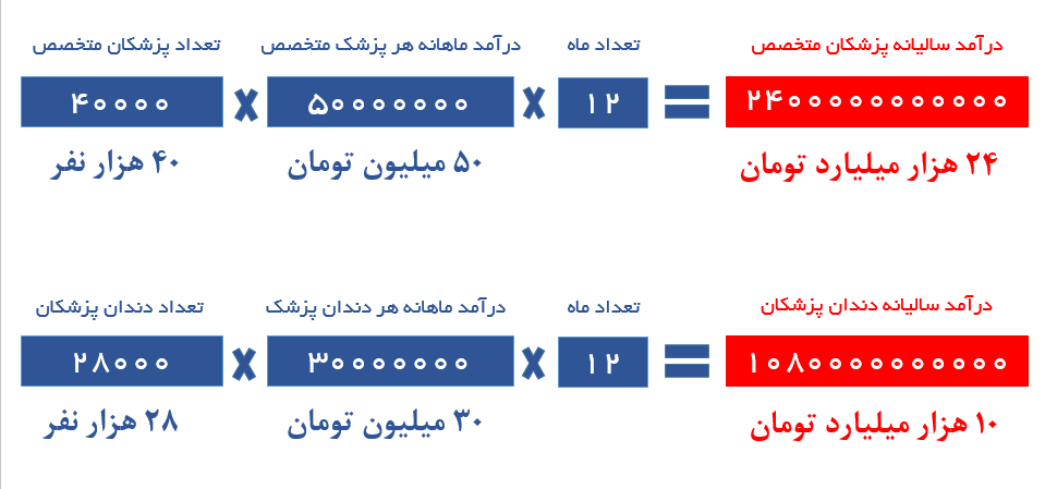 البته لازم است ذکر شود که مالیات ۷۰۰ میلیارد تومانی برای پزشکان رقم درستی بنظر نمیرسد زیرا تعداد پزشکان متخصص ۴۶ هزار و ۴۰۰ نفر در کل کشور است و اگر برای تعداد ۴۰ هزار نفر از آنان میانگین درآمد ماهیانه هر نفر ۵۰ میلیون تومان تخمین زده شود، درآمد سالیانه پزشکان متخصص ۲۴ هزار میلیارد تومان برآورد خواهد شد. همچنین اگر میزان درآمد سالیانه دندانپزشکان به این مقدار اضافه شود، میزان درآمد سالیانه این قشر، به عددی نزدیک به ۳۴ هزار میلیارد تومان خواهد رسید. مطابق با قانون، در صورتیکه حداقل ۲۰ درصد از درآمد مالیات اخذ شود، مقدار آن به رقمی نزدیک به ۶ هزار و ۸۰۰ میلیارد تومان خواهد رسید. این عدد معادل با یارانه یک سال ۱۲ میلیون نفر خواهد بود که رقمی بسیار بزرگ است.