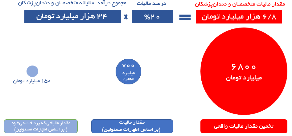 طبق موارد بالا مالیات واقعی (۶ هزار و ۸۰۰ میلیارد تومان) بدون احتساب پزشکان عمومی رقمی بسیار بزرگ است و مالیاتی که اخذ میشود بسیار اندک است و تقریبا نزدیک به ۶ هزار و ۵۰۰ میلیارد تومان فرار مالیاتی وجود دارد.