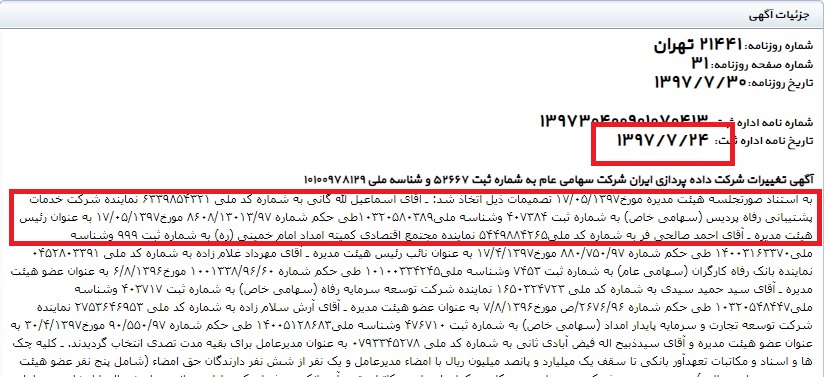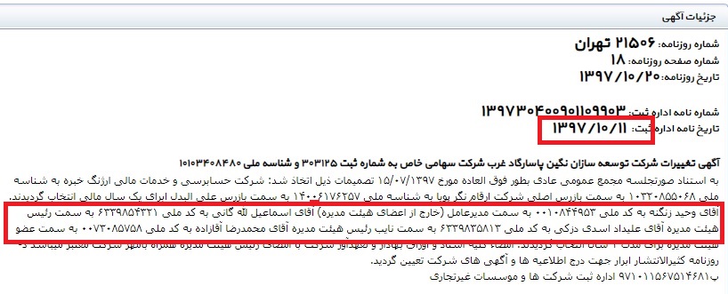 بر فرض استعفا و یا خروج وی از این سه شرکت؛ هنوز اطلاعات رسمی آن در بانک اطلاعات سایت روزنامه رسمی ثبت نشده است و این موضوع دغدغه مهمی است که شخص آقای مدیرعامل برای روشنگری و تنویر افکار عمومی، بایستی درباره آنها شفاف سازی نماید.
