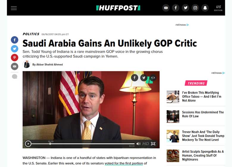 «سناتور “تاد یانگ” به تازگی مخالفت خود با جنگ خونین عربستان سعودی علیه یمن را اعلام کرده و تلاش کرده است تا از نفوذ خود، از جمله مسئولیتش در کمیته روابط خارجی سنا، استفاده کرده و سعودی ها را وادار کند که بی رحمی و وحشیگری خود در این جنگ را که تحت حمایت آمریکا صورت می پذیرد، کاهش دهند.