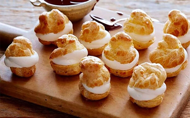 محتویات: آرد، تخممرغ، روغن، آب، شکر، وانیل، نمک، پودر قند و خامه