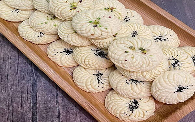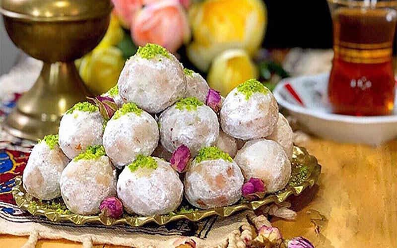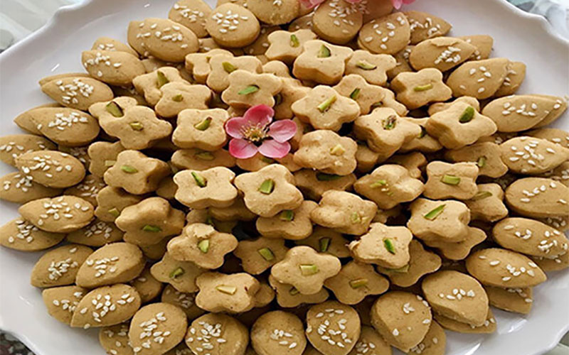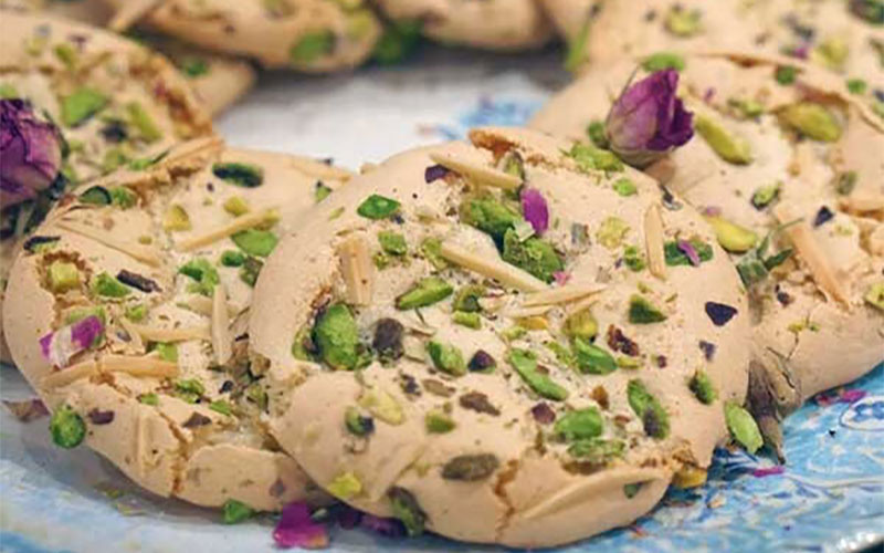 محتویات : پودر قند، کره، آرد برنج، تخم مرغ، گلاب، زعفران و خلال پسته