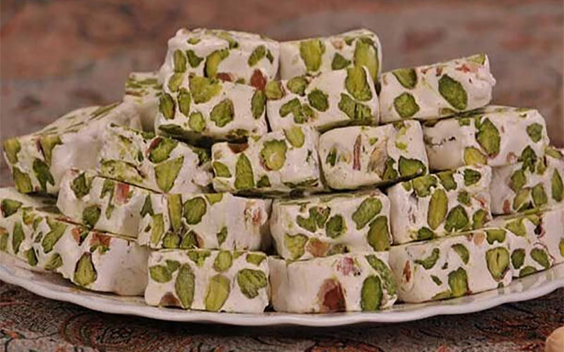 محتویات: شکر، آب، بادکا همان گلوکوز مایع از نشاسته ذرت، سفیده تخممرغ، گلاب و مغز پسته