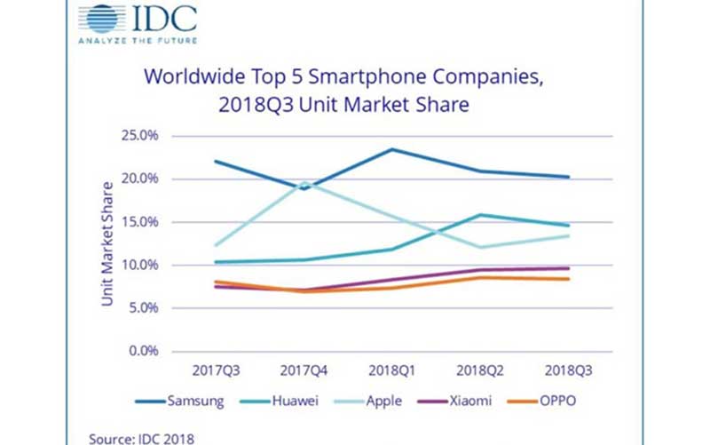 از لحاظ میزان عرضهی گوشیهای هوشمند، در واقع چهارمین سال متوالی است که گزارشها حکایت از کاهش عرضهی سالیانهی گوشیهای هوشمند را در بازار جهانی نشان میدهد. با این وجود و با توجه به آمار فوقالذکر، تغییری در موقعیت شرکتهای برتر رخ نداده است. سامسونگ جایگاه خود را در بالای جدول رتبهبندی حفظ کرده است و گزارش مالی فصل سوم ۲۰۱۸ میلادی نیز، عملکرد خوب این شرکت را نشان میدهد. بخش حافظهی غول بزرگ فناوری کره، نقش مهمی در این موضوع داشته است. گزارش IDC نشان میدهد که قرار گرفتن سامسونگ در چنین جایگاهی، عمدتا به فروش گلکسی نوت ۹ سامسونگ مربوط میشود.