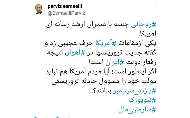 به گزارش خبرگزاری مهر، پرویز اسماعیلی معاون ارتباطات و اطلاع رسانی رئیس جمهور در توییتر خود، نوشت: «روحانی در جلسه با مدیران ارشد رسانه ای آمریکا: یکی ازمقامات آمریکا حرف عجیبی زد و گفته جنایت تروریستها در اهواز، نتیجه رفتار دولت ایران است! اگر اینطور است؛ آیا مردم آمریکا هم نباید دولت خود را مسوول حادثه تروریستی یازده سپتامبر بدانند!؟