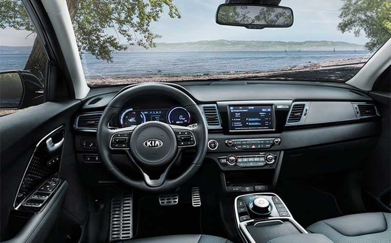در داخل کابین نیز وضعیت به همین ترتیب است و شاهد طراحی یکسان با سایر مدل‌های نیرو هستیم. البته به دلیل عدم نیاز به جعبه دنده در خودروهای برقی دیگر تونل جعبه دنده در کابین کیا E نیرو موجود نیست و اهرم تعویض دنده‌ نیز با یک کلید چرخان جایگزین شده است. این مورد سبب شده تا فضای داخل کابین افزایش پیدا کند و کنسول وسطی تبدیل به مکانی مناسب برای قرار دادن اشیا شود.
