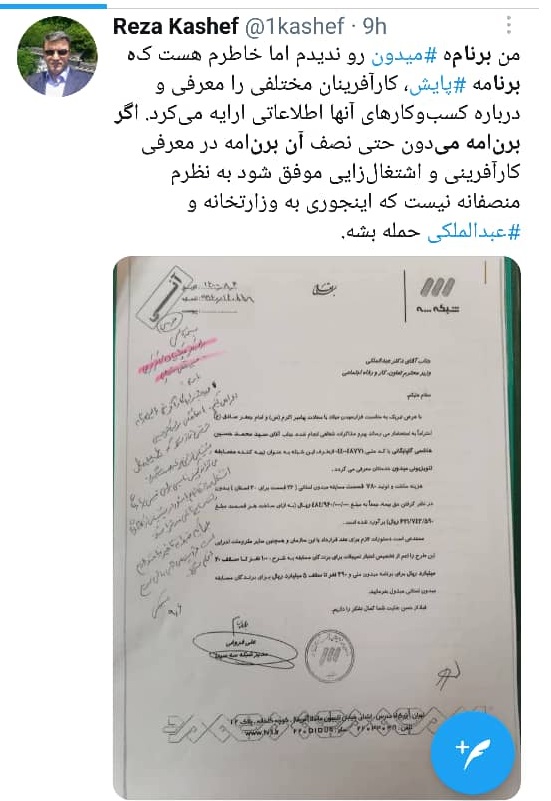 نامه ای که در پاسخ و ترتیب اثر با حمایت حداکثری حجت الله عبدالملکی رو به رو می شود و وزیرکار به یکی از مدیران زیر مجموعه خود دستور می دهد به میزان ۶ میلیارد تومان از منابع موجود در وزارتخانه به این برنامه تلویزیونی مساعدت مالی شود.