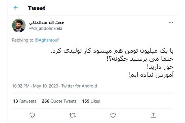 اما نکته جالب توجهی که در میان همه انتقادات وجود دارد، این موضوع است که برخی منتقدان با اشاره به یکی از اظهارنظرهای عجیب و غریب وزیر کار پیش از وزارت که گفته بود با یک میلیون تومان هم می شود اشتغالزایی کرد، به این مسئله ورود کرده اند و تأکید دارند که آقای عبدالملکی بر اساس تئوری خودش مبلغ کافی و مناسب برای اشتغالزایی به تعداد ۶ هزارنفر را به یک برنامه تلویزیونی هدیه داده است؛ مبلغی که شاید به نظر بسیاری برای اشتغالزایی به تعداد ۶ هزار نفر کافی نباشد ولی حداقل وزیر کار به این موضوع باور دارد و تازگی هم بر آن اظهار نظر قدیمی تأکید کرده است.